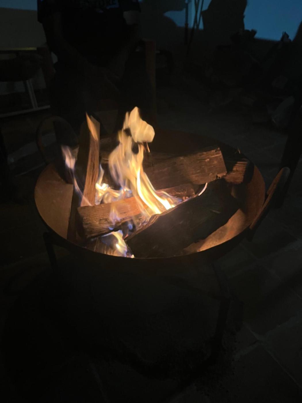 Guests can relax near the outdoor fireplace at the holiday home.